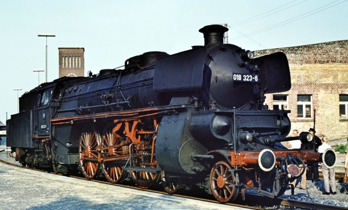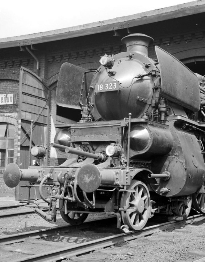 Bild oben: Die allerletzte Fahrt führte die 18 323 im September 1969 von Frankfurt nach Basel. Hier steht die Lok in BW Frankfurt Main. Copyright: Günter Hauthal / Slg. Eisenbahnstiftung