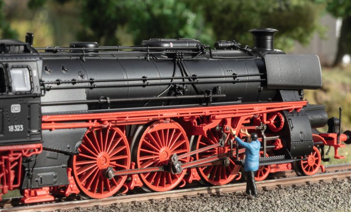 Märklin stellt die 18 323 als H0-Modell auf die Gleise und setzt der Baureihe damit ein würdiges Denkmal. Das neu konstruierte Modell erscheint als Märklin-Version unter der Artikelnummer 38323 und als TRIX-Version unter der Artikelnummer 25323. Es zeigt den Zustand um 1966. Die hochdetaillierte H0-Schnellzuglok ist überwiegend aus Metall gefertigt und mit einem Digitaldecoder ausgestattet, der zahlreiche Soundfunktionen ermöglicht. Außerdem besitzt das Modell einen eingebauten Raucherzeuger mit dynamischem Rauchausstoß. Die Führerstandsbeleuchtung kann, ebenso wie die Fahrwerksbeleuchtung und das Feuerbüchsenflackern separat geschaltet werden. Das 27,2 cm lange Modell durchfährt alle Radien ab R1 (360mm). Zum Befahren der kleineren Radien R1/R2 ist die Lok mit weit ausstehenden Leitungen unterhalb des Führerhauses ausgestattet. Diese Leitungen können für die Vitrinenpräsentation oder den Einsatz auf größeren Radien gegen vorbildgerechte engere Leitungen getauscht werden.